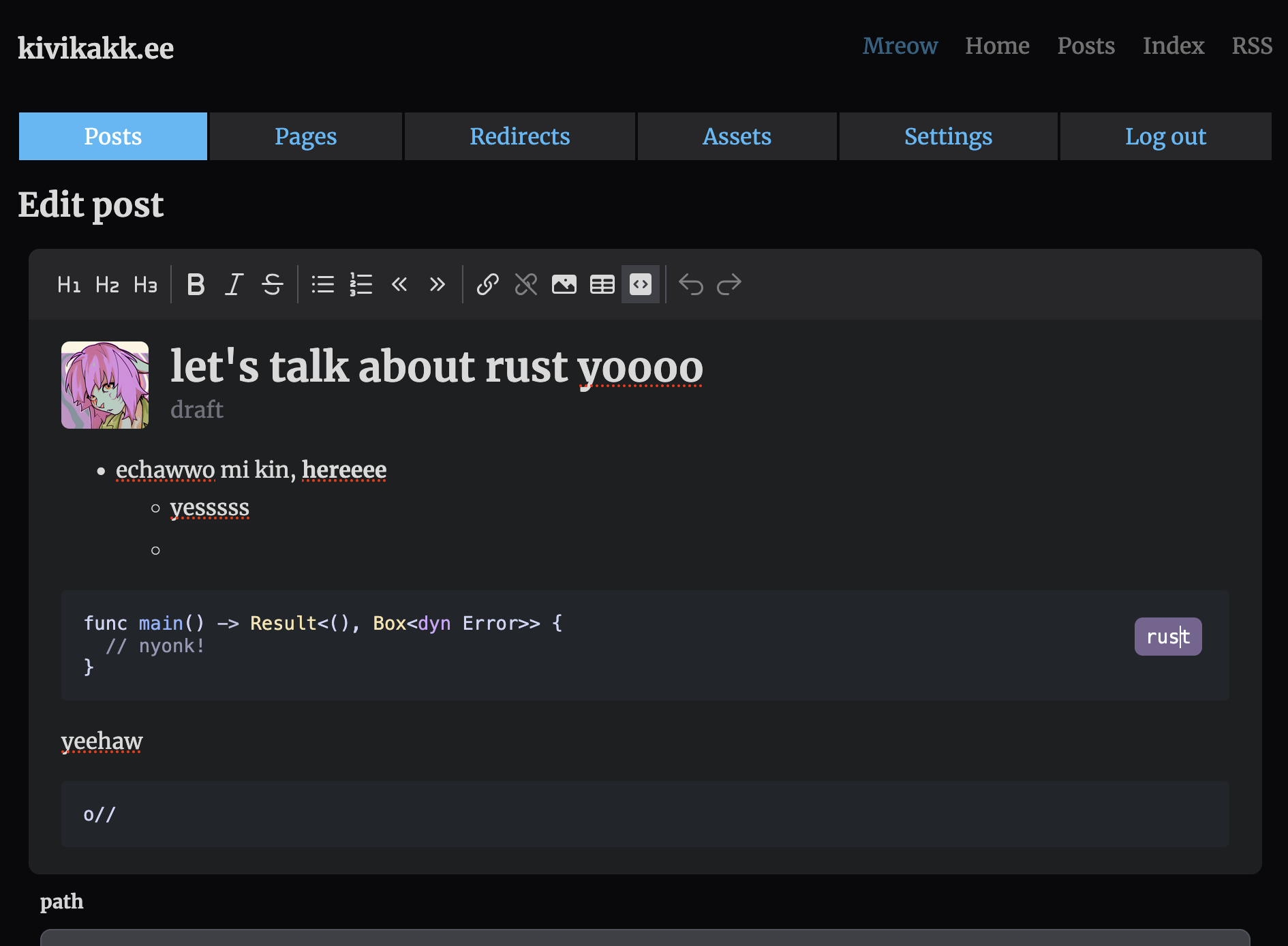 wip: WYSIWYG editor (just added the little language editor bit to code blocks) which is entirely CommonMark-driven! Behold: