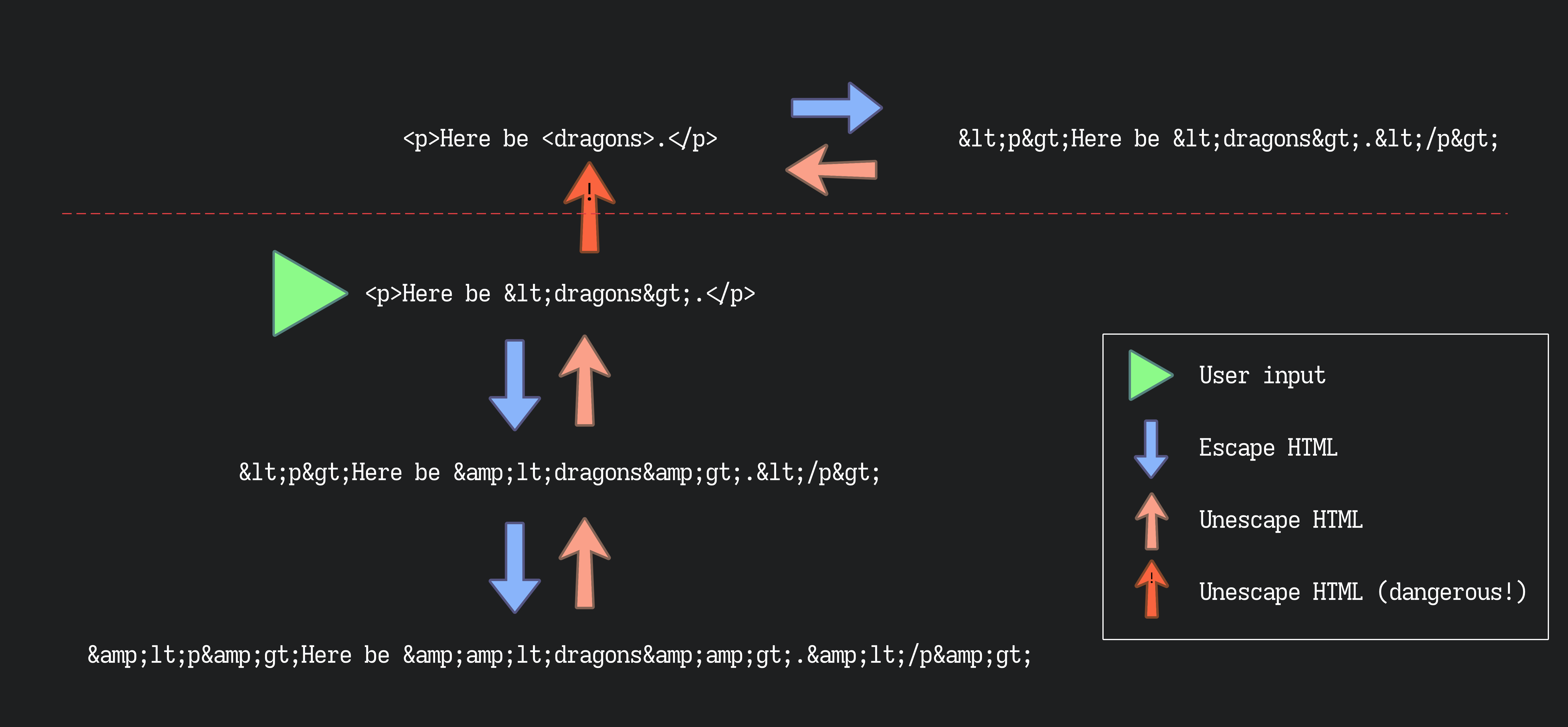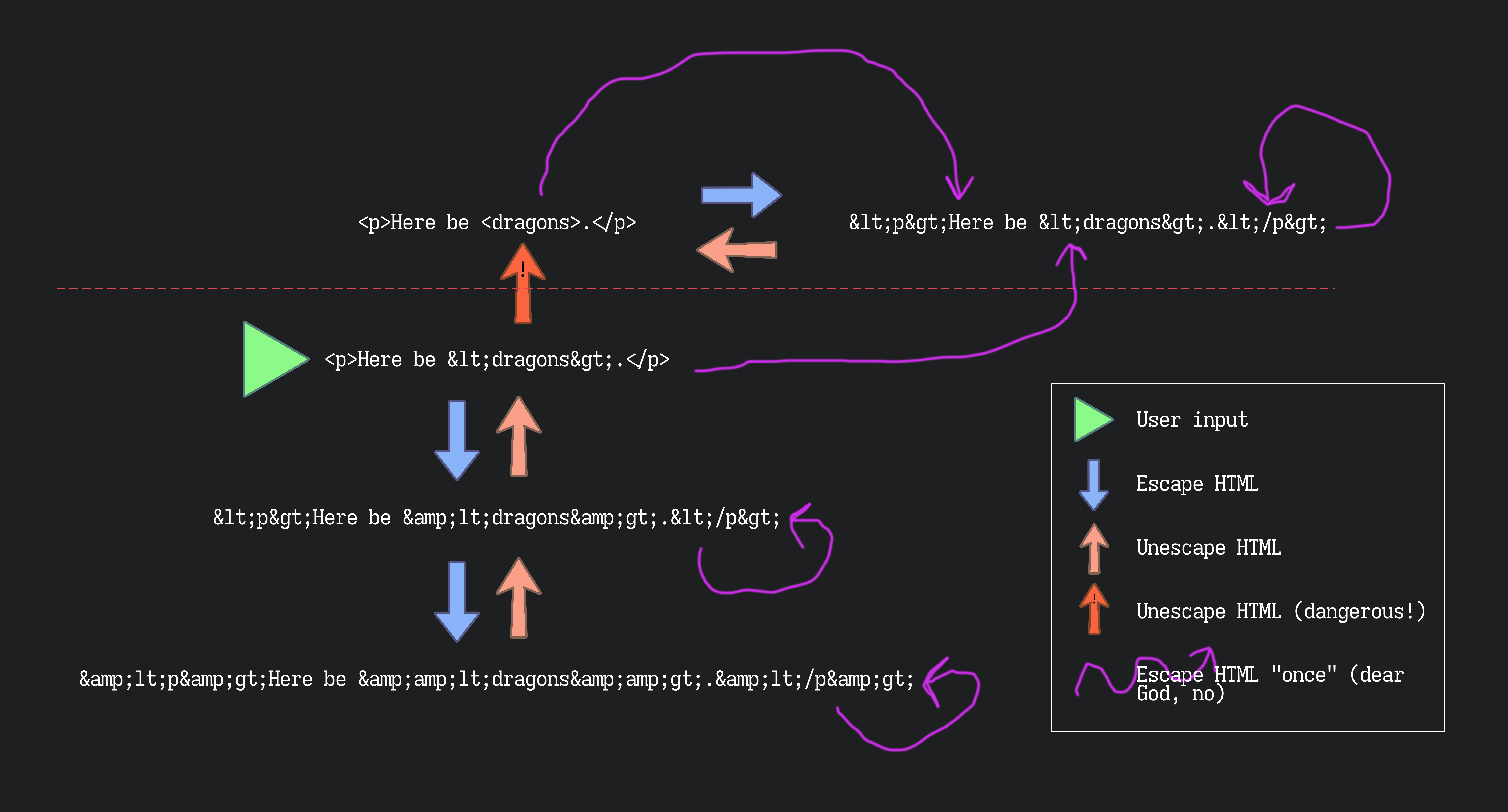 All those “I’ll get to it in a moment” bits come good here: you can’t unescape content that you didn’t escape first yourself. I mean, you can, but here be dragons strikes again. Note the dashed line which represents the Rubicon: once you pass it, you’re stuck on the other side. You’ve mixed trust levels again.